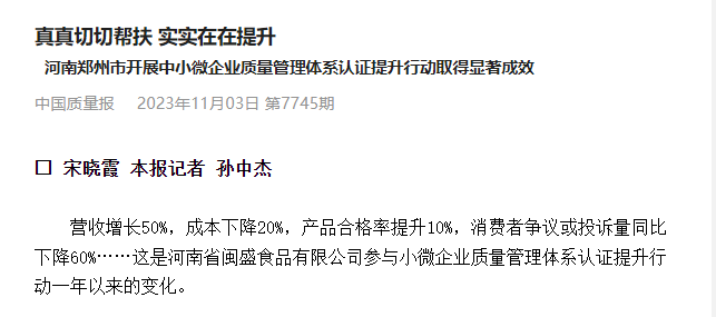 《中國質(zhì)量報》報道CQM方圓河南公司助力河南中小微企業(yè)質(zhì)量管理體系提升